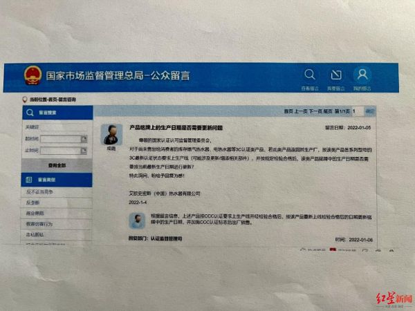 国家市场监督管理总局网站上的一则留言回复显示,2022年1月5日,艾欧史密斯(中国)热水器有限公司向国家认证认可监督管理委员会询问:对于尚末售出给消费者的库存燃气热水器、电热水器等3C认证类产品,若此类产品返回其生产厂,按该类产品各系列型号的3C最新认可状态要求上生产线(可能涉及更新增添相关部件),并按规定检验合格后,该类产品铭牌中的生产日期是否需要按当前最新生产日期进行更新?