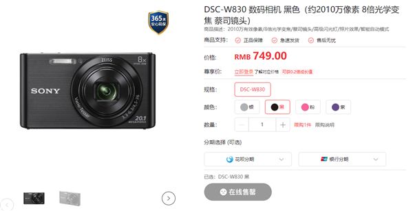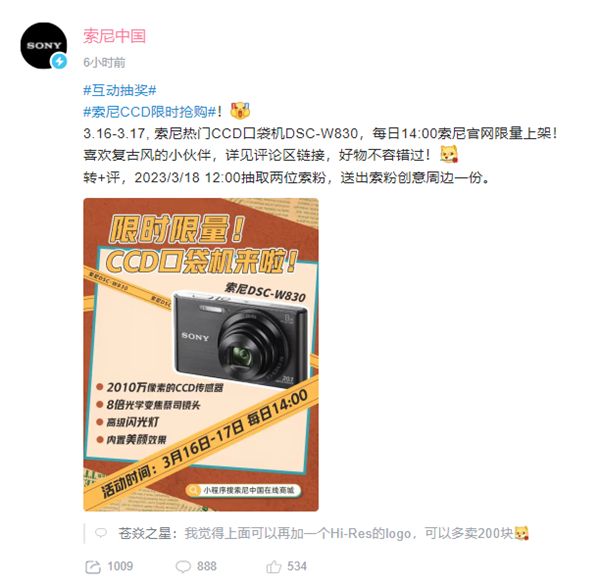 3月16日,索尼中国B站官方账号发文:3.16-3.17,索尼热门CCD口袋机DSC-W830,每日14:00索尼官网限量上架!