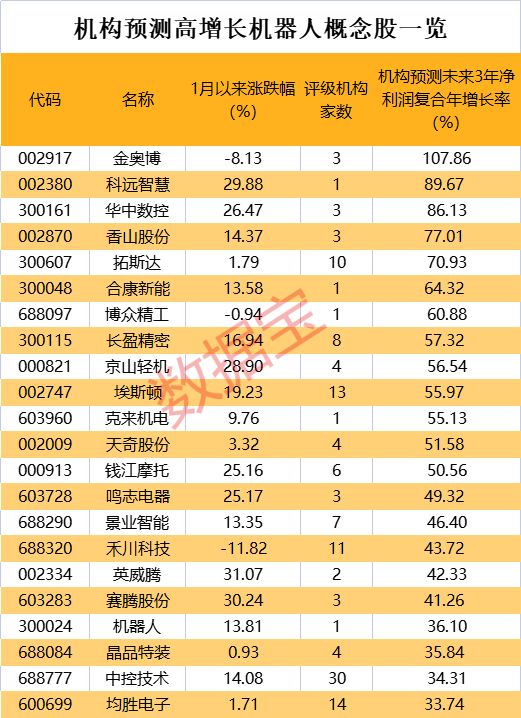 机构评级来看,科沃斯、美的集团、中控技术均超30家机构的密切关注。机构一致预测金奥博、科远智慧、华中数控等22股未来3年净利润复合年增长率有望达30%及以上的高增长。