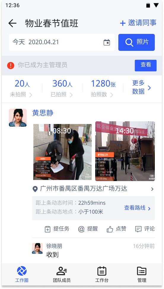 在团队管理上,通常无法对人员进行有效管理,无法实时对人员进行监督,因此工作效率一直持续下滑,马克水印相机的团队工作圈就可以解决这类问题。马克水印相机拍摄的照片可以自动同步团队,并且水印照片自动同步团队后,再也不用在工作群里面刷图和找图了。只需要翻看团队的照片即可了解当日的工作情况,并且团队内还可以进行任务的指派,使得整个工作环境形成闭环,每件事情都能轻松跟进。