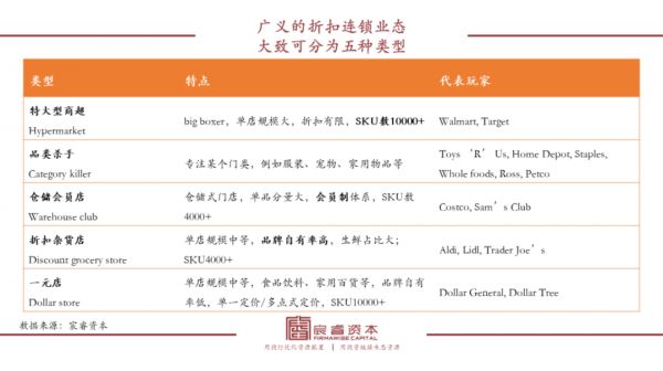 在欧美广义的广义的折扣连锁业态,包括了Target这样的综合性折扣商超(discount superstores)、Costco这样的仓储会员店(warehouse clubs)、Home Depot、Ross等“品类杀手”(category killers)、以Aldi和Trader Joe’s为代表的折扣杂货店(discount groceries)以及社区一元店(dollar stores)。