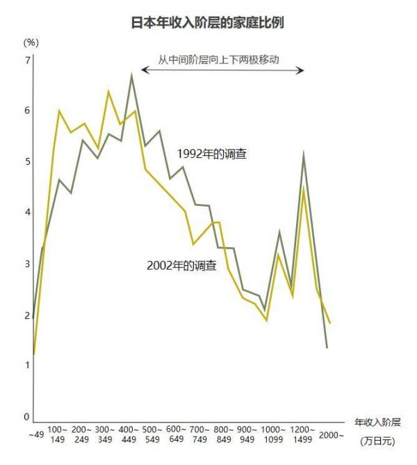 在2010年以前,日本年收入600万日元以下的中低阶级消费者占人口比重超过80%。中产阶级大量减少,收入阶层向低层和高层移动,国民收入两极分化,贫富差距不断拉大。