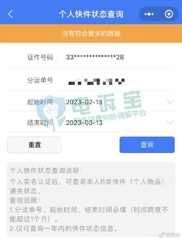 3月14日,浙江省卢女士向“电诉宝”投诉称自己于2023年3月6号在天猫国际买了香水,当天从香港仓库发货 ,3月8号提示需要进入掌上报关确认身份信息,然而输入卖家提供的运单号查询不到物流情况,故请求卖家核实运单号。