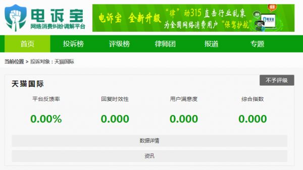 近日,国内知名网络消费纠纷调解平台“电诉宝”(315.100EC.CN)接到用户投诉“天猫国际”称其疑似虚假发货,运单号查询不到物流情况,用户申请退款屡次被拒。(详见网经社专题:“天猫国际”被指售假 售后体验不佳http://www.100ec.cn/zt/tmgjts/)