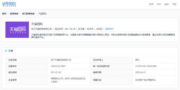据网经社企业库(COP.100EC.CN)显示,天猫国际隶属于浙江天猫网络有限公司,成立于2011年3月28日,公司位于浙江省杭州市余杭区,法定代表人为杨光。其自称是阿里巴巴旗下的跨境电商平台,主要是为国内消费者直供海外原装进口商品,自称是帮助海外品牌直接触达中国消费者、建立品牌认知和消费者洞察的首选平台。