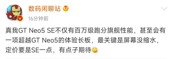 数码博主@数码闲聊站也表示,GT Neo5 SE甚至会有一项超越GT Neo5的体验长板,你觉得会是哪一项呢?