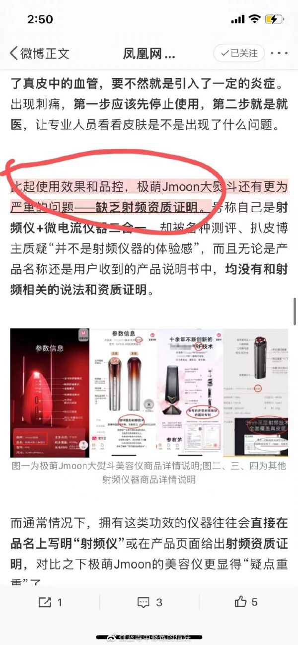 一些评测、扒皮博主表示,极萌Jmoon大熨斗美容仪在产品说明书中,根本没有和射频相关的说法和资质证明。