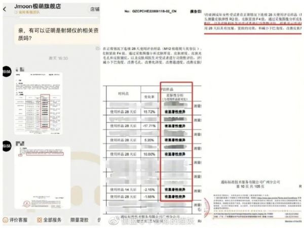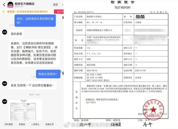 知名媒体账号凤凰网时尚也对此联系了极萌的店铺客服,结果确实让人哭笑不得:天猫旗舰店跟抖音旗舰店,两方出示的文件完全不一样,一份是产品的评估报告,一份是证明产品合格的检测报告,通通答非所问,无法给出射频资质。