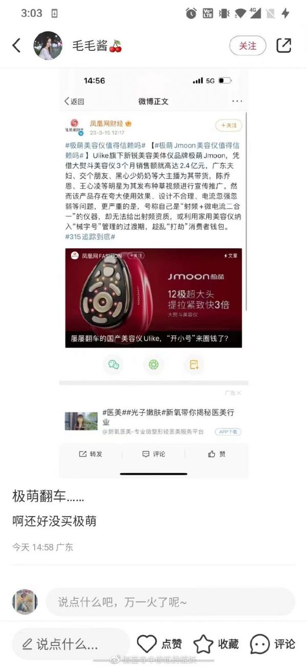 极萌Jmoon,是Ulike旗下新锐美容美体仪品牌,不得不说其营销还是做得挺成功,不惜重本邀请众多大V带货、明星种草,让自家的大熨斗美容仪一夜爆火,3个月的销售额就高达2.4亿元,店铺GMV提高了300%,还登上了“2023阿里妈妈38女性种草趋势榜”。