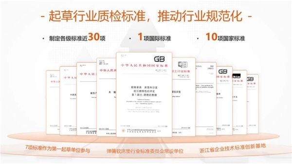 2003 年,喜临门首次将自己的技术探索上升至行业标准层面,作为主要参与单位发布弹簧床垫行业标准,之后在 2010 年更是以牵头起草单位修订发布该标准 QB/T 1952.2 — 2011《软体家具 弹簧软床垫》。2014 年,ISO/TC 136 国际家具标准化会议在上海召开,喜临门参与了《床的稳定性测试方法》等国际标准的制定工作,并在此后持续在中国企业参与国际标准制定的事务中发力,在国际社会上彰显了中国企业的标准化能力。