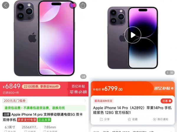 同款 iPhone 14 Pro 在拼多多、京东上的价格对比 | 图片来源:网络截图京东在带电类商品上的补贴力度确实更占优,但拼多多也相应的采取了发放优惠券等政策。举个例子,目前 128G 的 iPhone 14 Pro 在京东百亿补贴专题页中显示的价格是 6799 元,拼多多的价格虽然显示为 6849 元,但叠加相应优惠券后,拼多多同款商品的售价为 6649 元,反而略低于京东。