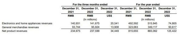 时代背景不可忽视,2022 年是以手机为主的 3C 品类低谷的一年,中国智能手机销量同比下降了 14%。但从与拼多多的横向对比来看,据相关媒体报道,去年 618 期间,拼多多的 GMV 增速达到了 25%,其中手机品类同比增长 148%,家电品类同比增长 103%。而在此次财报中,京东 2022 年电子产品及家用电器收入为 1416.75 亿元,同比仅增长 0.5%。