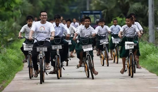 Thae Su Wai学校收到捐赠的学生/法新社 2018年6月,oBike在新加坡停止运营,公司解题,大量的单车被废弃在公园、路边等公共场所,缺乏维护,无人问津。看到这种景象,迈克萌生了“少走路”计划的想法。