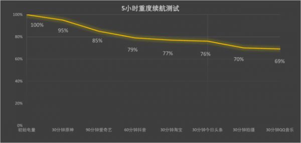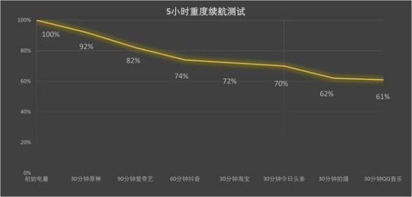 我们本次对比测试采用了5小时重度续航测试模型,该模型不但包含了30分钟原神游戏、90分钟网络视频播放等负载场景,还会全程保持手机亮度在50%的水平,可以说压力满满。经过实测,在进行了包含游戏、视频播放、音乐播放、新闻阅读、照片拍摄等应用场景的续航测试之后,三款机型剩余电量与电量消耗曲线图如下: