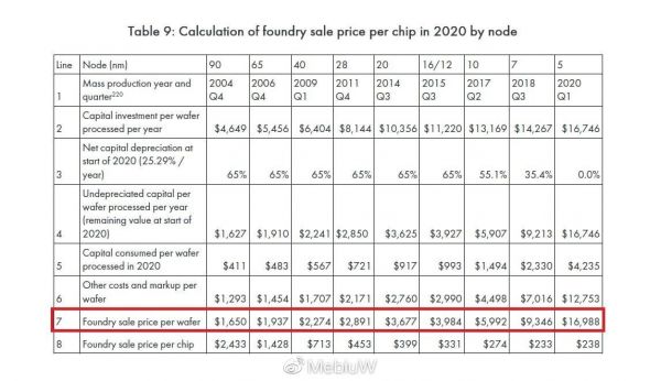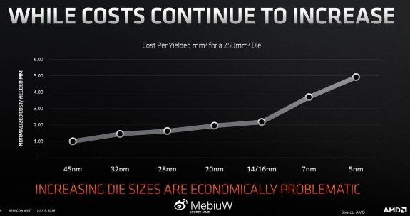 要谈用成熟工艺降低成本的事情,那么我们首先要看14nm和7nm的成本分别是多少。普遍来看,7nm这个节点对比14nm/16nm这个节点,单位面积制造成本是2倍或者更高的。