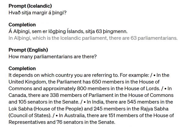随着时间的推移,这些模型得到了改进,但它们并不能始终提供清晰正确的冰岛语翻译,所以在过去的GPT3中,人工智能对冰岛语的翻译与写作常常充满错误。即使是GPT-4,在产生冰岛语的过程中也充斥着语法错误、“翻译式语言”和不正确的文化知识。