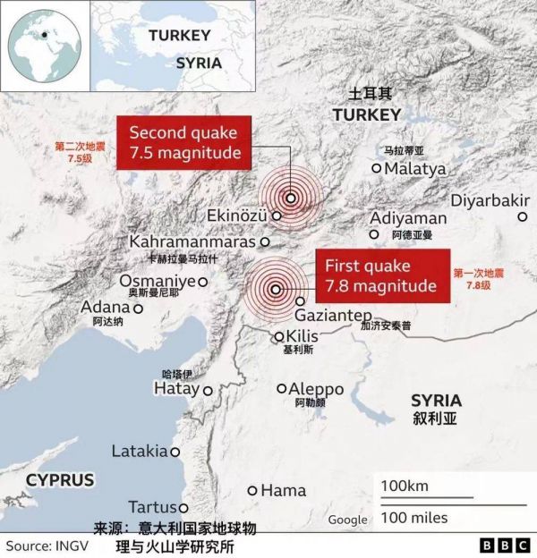 哈塔伊市位于哈塔伊省,这里紧邻地中海,位于土耳其最南部,东部与叙利亚阿勒颇省接壤。7.8级和7.5级的两次强震,给土耳其南部和叙利亚北部带来巨大伤痛。土叙两国公布的最新数据显示,已有超过2.8万人遇难。