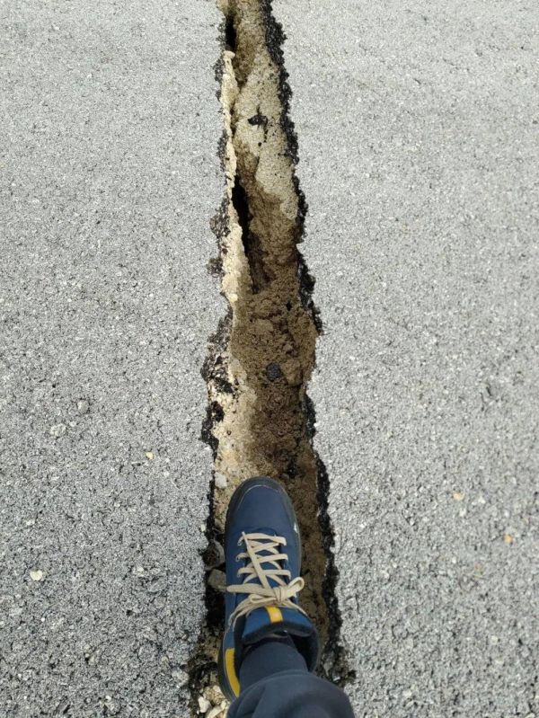柏油地面已有多处裂缝,其中一些裂缝比我穿的鞋还宽——这是2月6日的两次强震造成的。