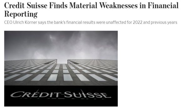 对于瑞信而言,其股价周三的重挫令本已充满挑战的一周雪上加霜——当地时间周二,瑞信称该行在2021年和2022年的财务报告内部控制方面发现了“重大缺陷(Material Weakness)”,审计机构普华永道给予了否定意见。