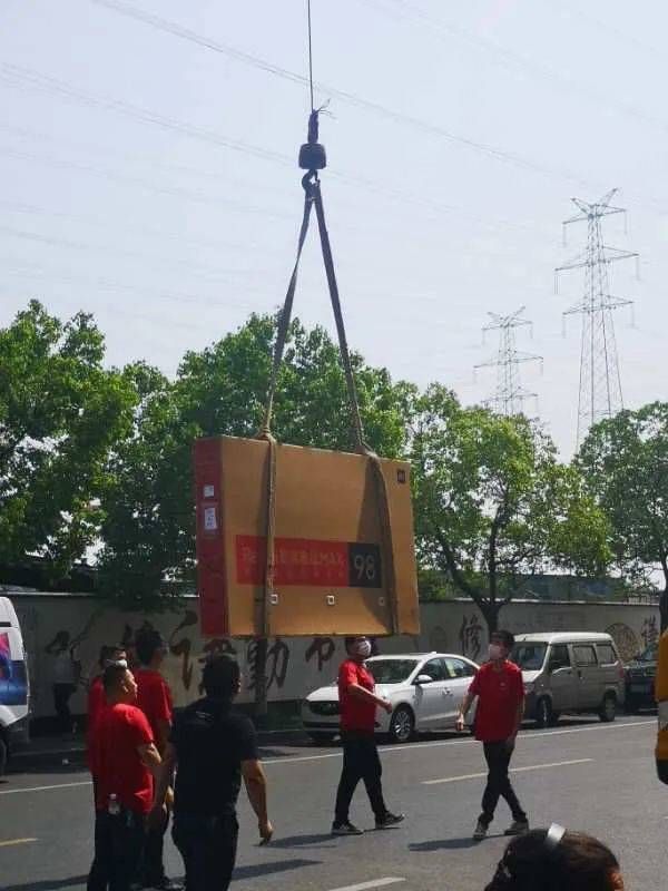 由于98英寸电视机的超规格体积问题,从下4月9日订单到勘测场地,到最终5月13日完成安装耗时长达一个多月。为了电视机的顺利安装,我同意小米方面帮我找到一台吊车,自费2500余元进行离地40米的吊装作业。上述震撼人心的照片在通过社交网络分享后迅速引发热议,雷总、卢总的微博都对我的这次行动以转发微博的形式进行肯定,雷总微博当时评价是:买了98寸,就低调不了。