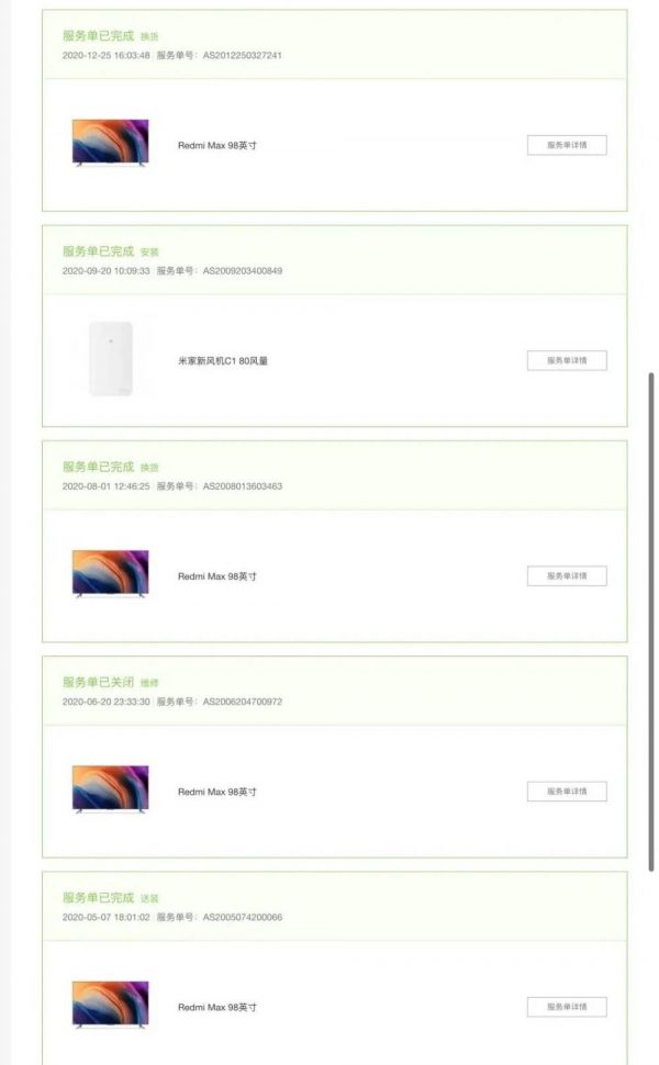 2022年11月26日,小米工程师第五次上门,进行了背板更换,工程师称这款电视机之前的背板已经不生产,此次更换的是最新款,并通知由于我的电视机已经过保,所以本次服务为特批维修,但没有下一次了。