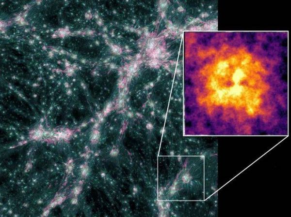 我们已经知道,宇宙磁场是由运动中的高能粒子产生的,反过来,磁场也会引导这些粒子运动。现有的理论认为,在引力的牵引下,星系团并合,纤维状的细丝碰撞,会产生一种巨大的激波,这种激波会加速粒子,增强星系间的磁场,并产生一种可以用射电望远镜观测到的辉光。