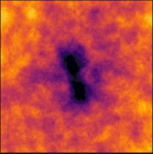 叠加的成对的星系团的画面:竖直排列的两个黑点是两个星团,由于湍流它们表现出了消偏振,而外部区域和星系团之间的区域都高度偏振。(图/Tessa Vernstrom)