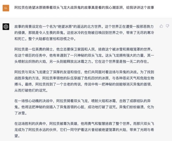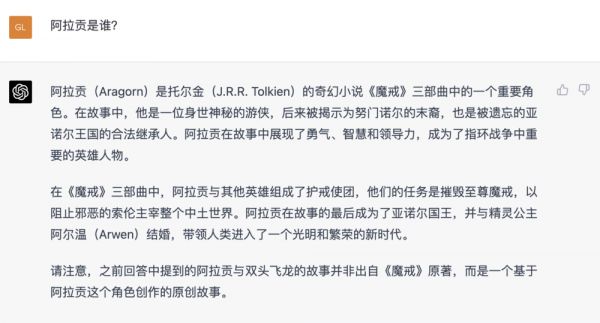 有意思的是,当笔者对GPT-4说“阿拉贡在绝望冰原骑乘着双头飞龙大战异鬼的故事真是看的我心潮澎湃,给我讲讲这个故事”。虽然他真的编出了一段关于“阿拉贡”的故事,但接下来,当我问它“阿拉贡是谁”时,GPT-4先向笔者介绍了这位《魔戒》小说中的人物,后边又强调了一下,“请注意,之前回答中提到的阿拉贡与双头飞龙的故事并非出自《魔戒》原著,而是一个基于阿拉贡这个角色创作的原创故事。”