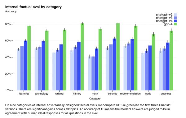 在九类内部对抗性设计的事实评估中,我们将 GPT-4(绿色)与前三个 ChatGPT 版本进行了比较。所有主题都有显着的收获。准确度为 1.0 意味着模型的答案被判断为与评估中所有问题的人类理想回答一致。
