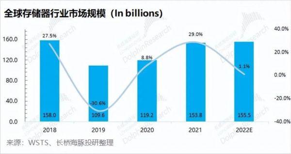 1)全球的存储器市场规模:大约有1500亿美元左右。全球市场曾在2019年遭遇行业寒冬影响出现较大下滑,之后又随着下游需求逐渐回暖。虽然2022年的下半年行业再次开始下滑,但WSTS预计全年存储器市场仍达到1555亿美元。