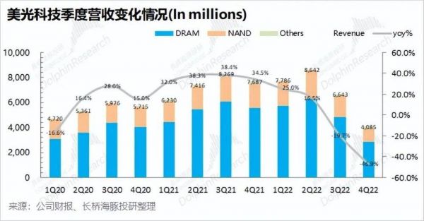 2022年四季度公司实现营收仅有40.85亿美元,同比下滑46.9%,而其中DRAM和NAND业务均出现了较大的下滑。