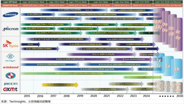 DRAM:从市占率看,三星、海力士和美光基本垄断了整个DRAM的市场。在技术能力上,三家面向DDR4、DDR5和LPDDR5应用,都已经以15nm和14nm级别的单元设计规则(D/R)发布了D1z和D1α节点的产品。