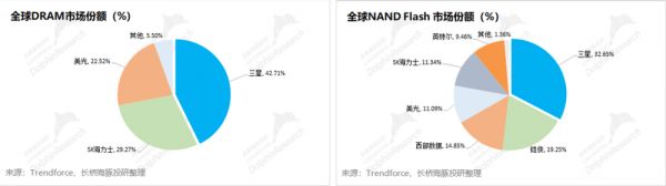 DRAM和NAND是存储芯片最主要的两类产品,是我们平时熟称的“内存”和“闪存”,两者合计占全球存储芯片的90%以上。