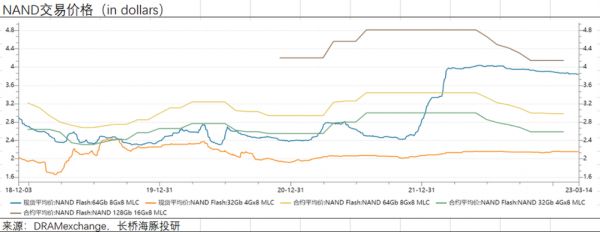 2)NAND市场价格:整体来看NAND的价格相对平稳,波动小于DRAM的价格。但从三个合约价的变化来看,整体大厂从2022年下半年开始对NAND价格的预期相对较弱。同样也反映了,存储在NAND端也存在供过于求的情况。