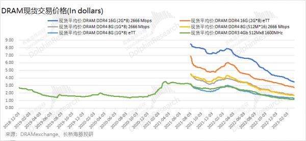 1)DRAM市场价格:目前市场上主流的DRAM产品为DDR4产品。而DDR4全系产品的现货价格从2022年下半年一直频频下降,直接反映了当前市场供过于求的情况,整体行业进入下行周期。