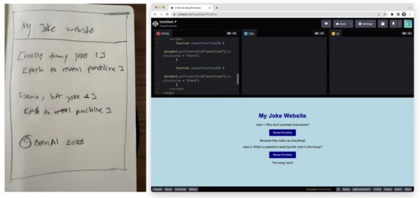 GPT-4 能根据手绘草图生成完整的网站前端代码。发布会上,布罗克曼在纸上简单手画了一个 “笑话网站” 页面草图,将它输入 GPT-4 后,只等了 10 秒,系统返回一段代码,代码输出就是一个网页。
