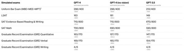 在美国大学入学考试 “SAT” 测试中,GPT-4 在满分 800 分的数学测试中拿到 700 分,超过 89% 的人类,而 GPT-3.5 得分是 590 分。加上在 SAT 阅读写作项拿到的 710 分,总分 1410 的 GPT-4 已可冲刺申请斯坦福、耶鲁等名校。