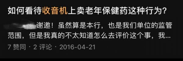 与此同时,蓝鲸财经记者注意到,此类情况似乎从2016年便已开始出现。彼时,某乎平台有网友曾提出问题:“如何看待收音机上卖老人保健药这种行为。”