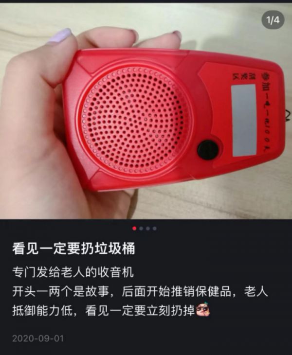 图片来源:某乎平台截图此外,在另一内容社交平台,也有部分网友表示自己家的老人也经历过类似“套路”,有些甚至已被洗脑花费几万元。而其中一条来自2020年的帖子中曾表示,这类专发给老人的收音机,开头是一两个故事,后面开始推销保健品。“老人抵御能力低,看见一定要扔垃圾桶。”该网友提醒道。