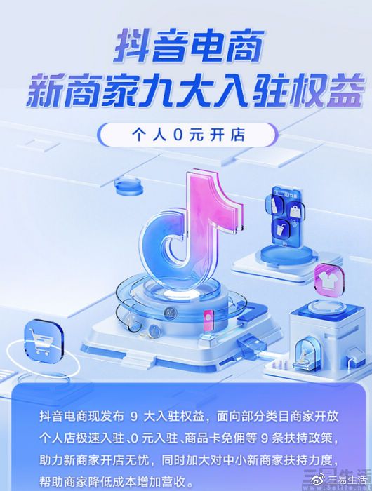 其中抖音电商不仅推出了"0元入驻",即部分新商家在无需缴纳保证金的情况下,先入驻进行有限制的试运营,后续再通过货款逐步充值保证金。此外,其还为个人商家提供了商品卡免佣、运营方法指导和免费培训课程,以及经营必备工具免费使用等多项权益。