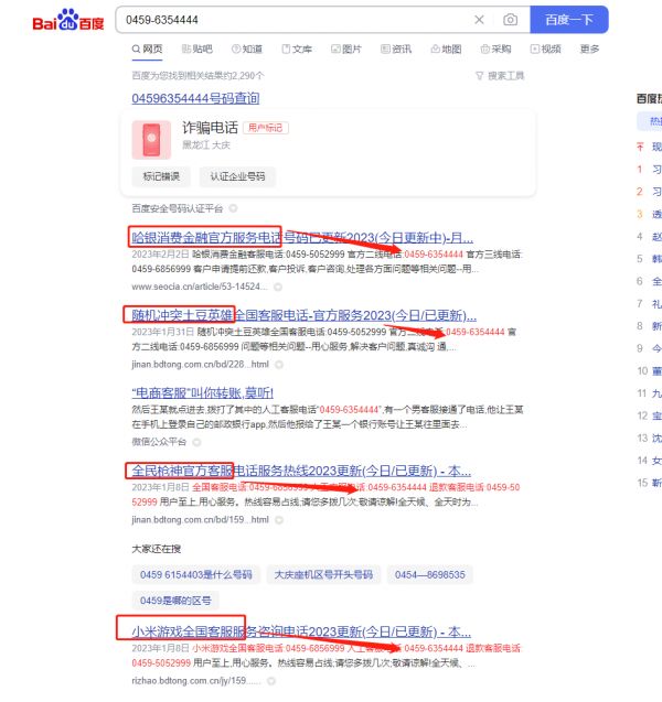 将其中一个号码复制后反向检索,发现该号码还声称是“哈银消费金融官方服务电话”“全民神枪官方客服电话”“小米游戏全国客服电话”,而该号码在百度首页首条已被标注为“诈骗电话”。