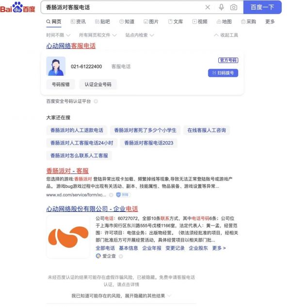 澎湃新闻记者注意到,在搜索引擎上检索“香肠派对退款客服电话”,一页可以出现十多个不同的电话,均称“香肠派对全国退款客户服务在线电话”,难辨真假。