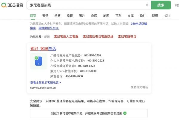 360和搜狗搜索引擎也进行了类似的探索。澎湃新闻记者注意到,在360搜索引擎上搜索XXX品牌客服电话,同样也会在首页首条出现经360官方整理的客服电话结果,而其他网页的电话会被折叠,且进行安全提示,用户点击后才能展开全部结果。