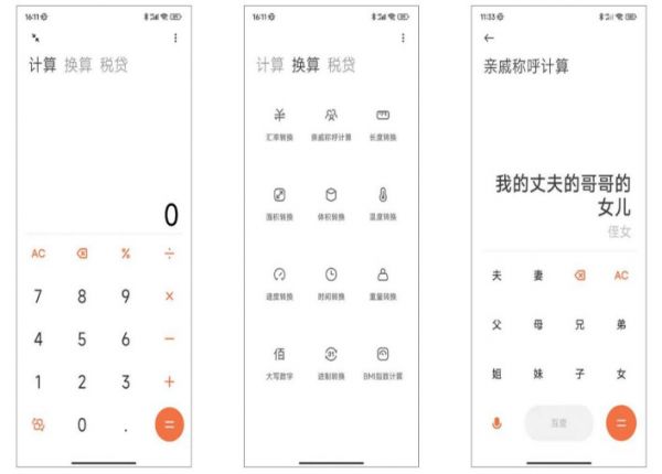 除了常规的计算功能,还可以进行个税和房贷这种专业的计算,还有换算功能,在换算功能里,除了生活中最常用的汇率、度量衡的换算,还可以进行亲戚间称呼的换算,比如输入“丈夫的哥哥的女儿”,会得到答案“侄女”。