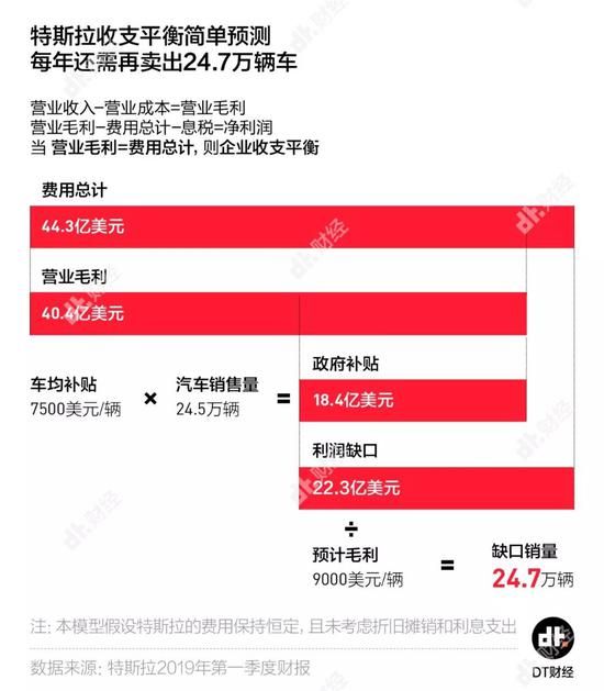 DT君粗暴地帮特斯拉建了个模型,在比较乐观的条件下进行了一个简单的估算,帮特斯拉看看,要实现收支平衡,卖车业务还得多努力(此处未考虑折旧摊销和利息开支)。