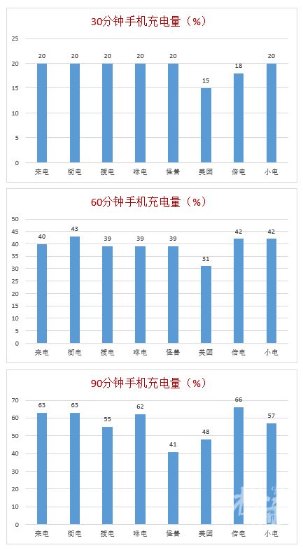 专业测试数据显示,用市面上的共享充电宝给手机充电,充30分钟电量最多达到20%,充60分钟电量达到40%左右。部分品牌表现差强人意,要充90分钟,手机电量才超过40%。
