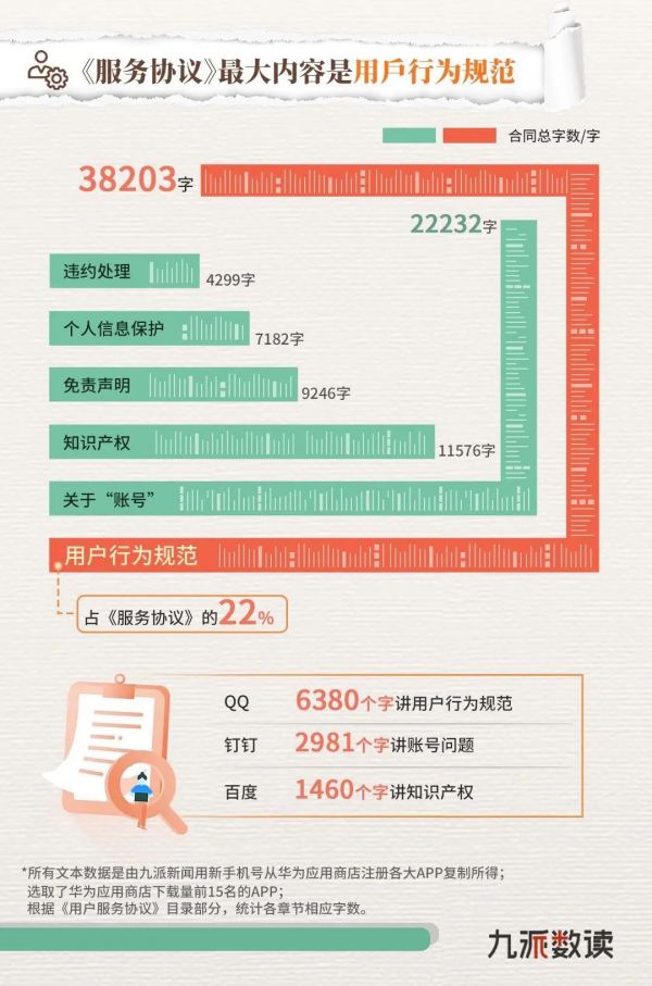 其中,用户行为规范的行文总字数高达3.8万字,占比22%。特别是在QQ的《服务协议》中:总计1.2万字的文本,用户行为规范的相关章节高达6380字,占了总文本的50%,是15款APP中用户行为规范文本占比最高的。