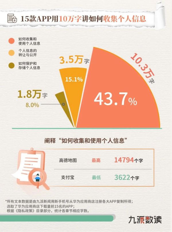在“如何收集和使用个人信息”的问题上,15款APP总共写下了10万字的相关说明,占《隐私政策》整体的43%。