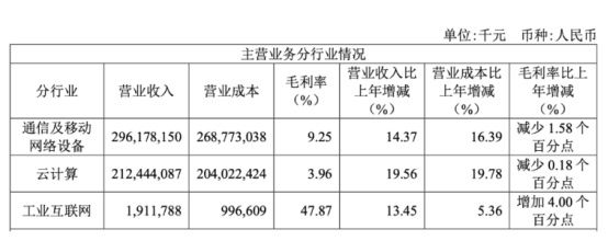 这或是因占据公司近六成营收的通信及移动网络设备业务毛利率出现下滑。2022年通信及移动网络设备业务毛利率约为9.25%,较2021年下降约1.58%;云计算业务的毛利率也相对较低,仅约3.96%,且较2021年减少0.18%。