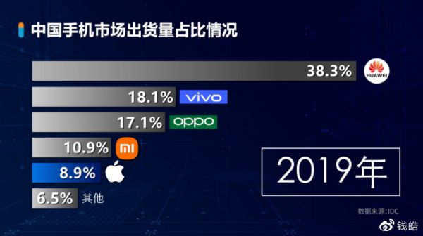 而在苹果官方推广24期免息分期之前,iPhone在中国的销量正经历一段不小的低谷。在2019年时,它在中国的市场份额,不到榜一大哥的四分之一。
